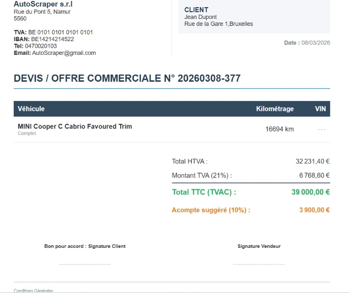 Enregistrez vos véhicules suivis intégré et générez des documents PDF (devis, factures, bon d'achat) en un seul clic.